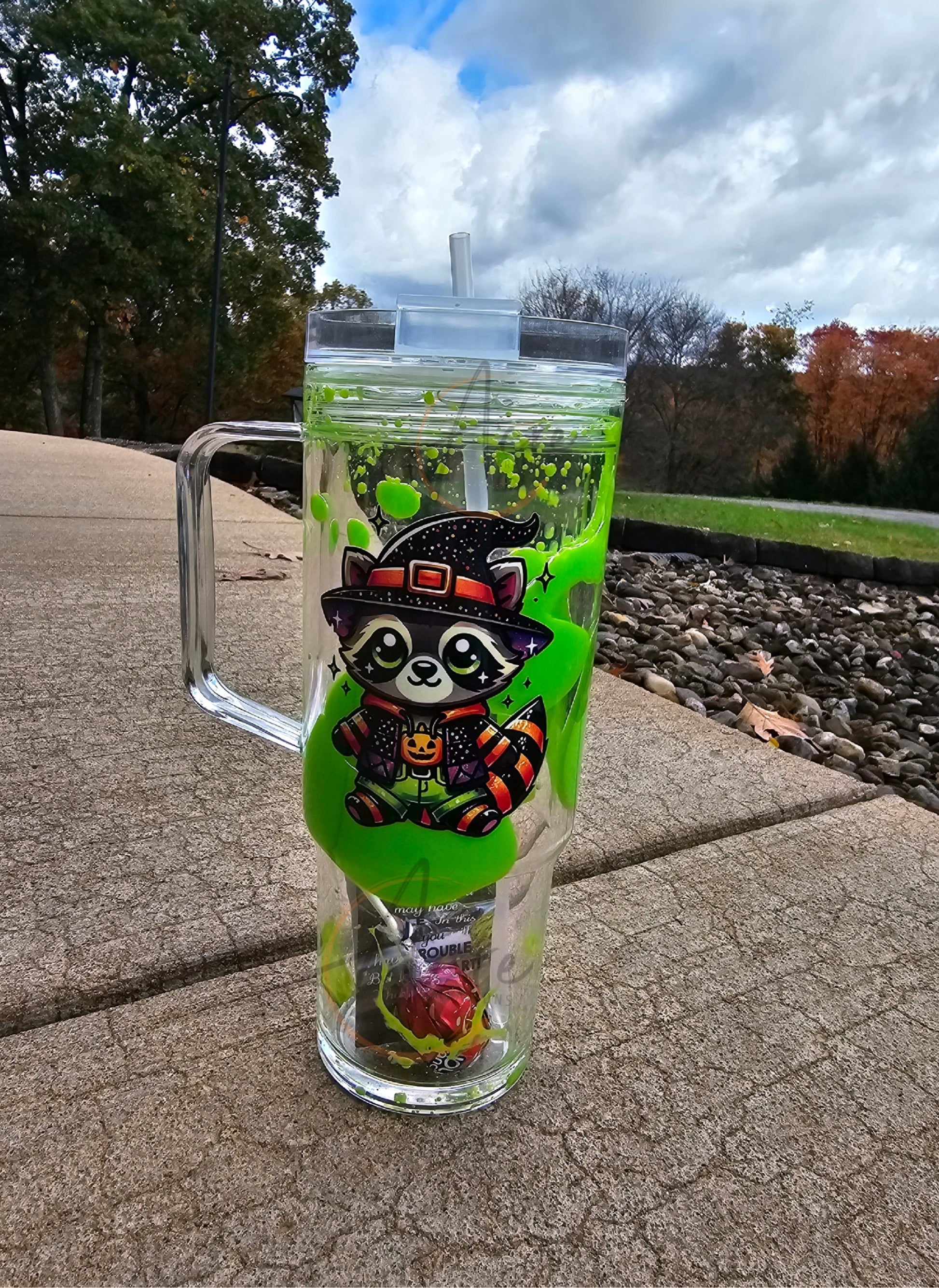 Elevate your beverage experience with this striking 40oz lava drip cup, featuring a mesmerizing cascade of molten-inspired design flowing across an enchanting witch raccoon character. The generous capacity makes it ideal for keeping your favorite drinks at the perfect temperature throughout the day, while the eye-catching Halloween aesthetic adds personality to any collection. Whether you're a seasonal enthusiast or year-round fan of whimsical drinkware, this cup combines functional design with distinctive visual appeal that stands out from standard options.